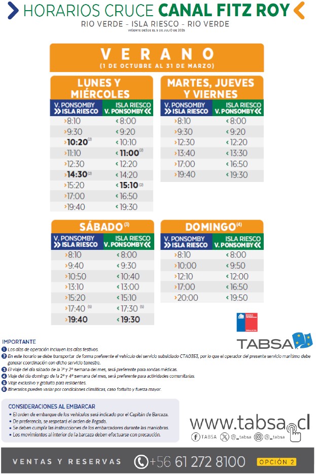 La empresa TABSA ha acogido el requerimiento presentado por la Ilustre Municipalidad de Río Verde, implementando una modificación en los horarios de verano del servicio de cruce marítimo entre Isla Riesco y el Continente.